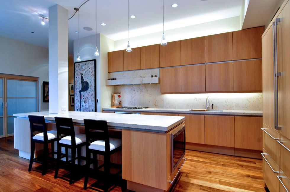 The kitchen and bathroom designs used warm maple cabinetry to create a unifying look in the loft and allow the perfect back drop for the couple's unique artwork collection.